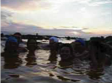 鯵ヶ沢の海岸線を走る頃には気分は「少年時代」。深い山からは夏の匂いがプンプン、単線の線路が電車好きの心を刺激します。途中アーティスト魂に目覚めたフッキーが撮影中に鳥にうんこをかけらるといううれしいハプニングもありましたが、無事白神近郊の十二湖近郊に夕方到着。そこでよくテレビにでてくる露天風呂を発見。日本海の波内際で夕日を見ながらの絶景スポット、その名も不老不死温泉。しかも混浴!がいたのは地元のじい様達のみ。期待に妄想が爆発しそうだった我々は己の浅はかさを呪うのでした。ここの夕日は本当にヤバい。日本人の心を刺激する場所です!青森にいったら必見スポット。このときばかりは一同、XXXXのシワがのびきるまでゆっくり温泉につかりました。その後十二湖畔のオートキャンプ場、その名もリフレッシュ村に到着。明日からは白神三昧で釣りで〜す。 |