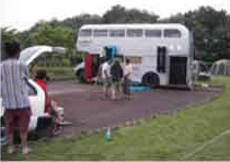 夜中に青森港を出発し次の目的地、盛岡まで。国道4号線を辿るこれまでで一番のロングドライブ。マット達がルートを下見にいった様子だと、途中かなり電線の低い町中を抜けなければならないとのこと。夜道の行軍といいかなり不安。「おい、路肩に気をつけろ!」「スピード落とせバカ!」随分上から見下ろすようにしゃべるんですねって当たり前でしょ、上から見てるんです。地上4メートルから見ると信号も看板も何もかもが狂気、いや凶器。が、途中の山岳地帯を抜け、空も白ける前の午前3時頃の風景はまるで銀河鉄道のよう。時速40キロでゆっくり巨体を振るわせ走るバスの中は発電機で照らされた白熱灯がこうこうと灯り、ゆっくりとその影を朝の光に浮かび上がらせる東北の田園地帯をまるで汽車のように進んでいく。ポエマー、フランキーは宮沢ケンヂの詩集を持っています、そうです俺たちはイーハトーブの国を突き進んでいるんですね。この時ばかりは部室臭いバスの中もメルヘンな香りが。チィ、これで怖くなきゃ最高なんだけどな。朝には駅の道で小休止。それからはいよいよ難関、町抜け。細い商店街や、電線の下を路肩の全くない道でキャンプ場までの残り10キロを走破しなければいけない。トランシーバーで車同士連絡を取り合っての連携プレー。運転席のマットから緊迫した無線が入る.何だ?どうした?橋の高さがやばいのか?「米沢牛、米沢牛、米沢牛ってこのへん?食いたいんだけど?」カニ、カニ、うるせえと思っていたらこんどは牛かい!米沢は山形だ馬鹿やろう、頼むから運転に集中してくれ!バックにかかるのはルー・リードの「ワイルドサイドを歩け」。そうか、ワイルドサイドとは路肩のない道を行け!ってことだったんですね、今わたしたち、そう解釈させていただきました!歩いてます、歩きまくっていす。ビビり、のたうつこと合計10時間、ついにパーティ会場妻の神キャンプ場に到着。ここはヤバいです。うしろに南部富士をのぞみ、川が流れ、その前をゴルフ場のグリーンより青い芝生が広がるキャンプ場。天気さえ良けりゃ日曜の二日酔いはギャランドゥ、いやギャランティの絶好ロケーション。これからわたしら明日の準備して飯くって、露天以来の風呂にでも入ってとっとと寝ます。皆さん明日〜! |